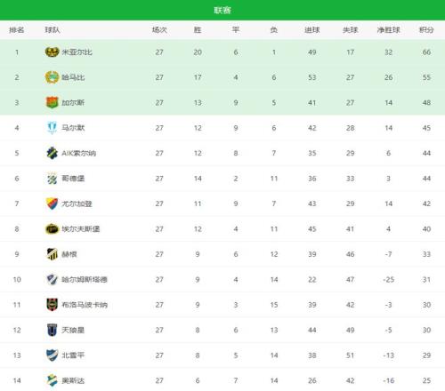 在比赛前,米亚尔比积63分,领先排名第二的哈马比8分,联赛还剩下4轮,只要本轮全取3分的话,那么将提前3轮夺冠,最终在主教练托尔斯滕松全取3分,如愿夺冠,并创造了瑞典足球百年历史上最不可思议的一幕,这妥妥的就是莱斯特城奇迹再现的存在啊。
